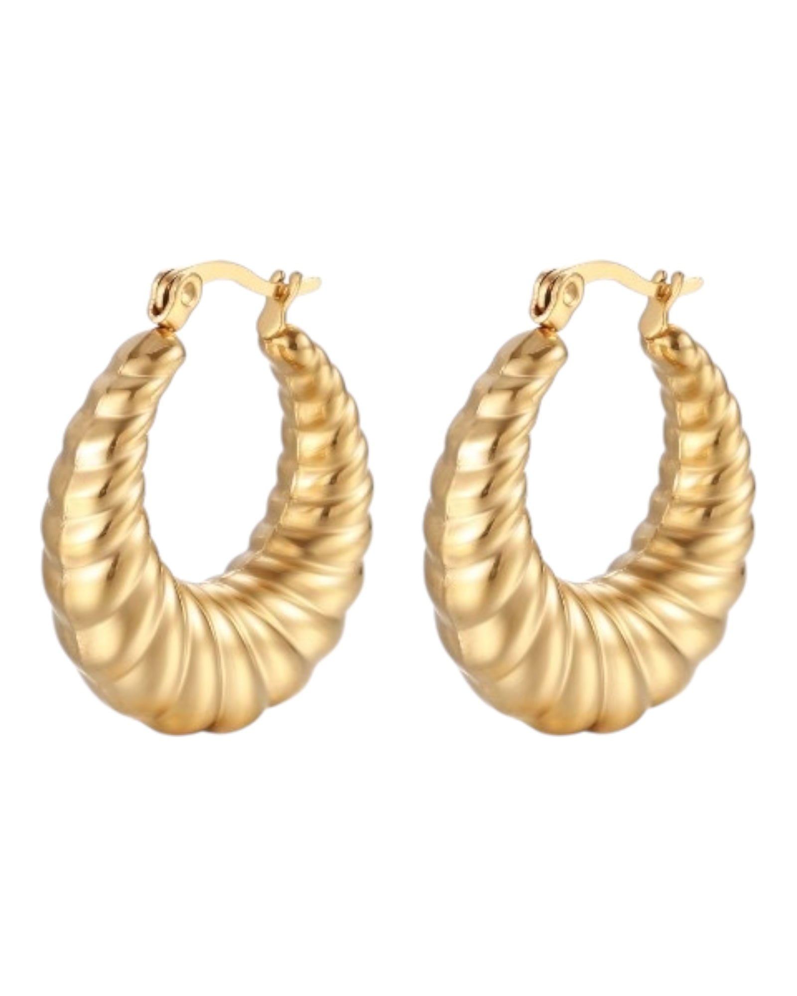 Estos aretes de aro con diseño espiral y acabado brillante aportan elegancia y estilo a cualquier look. Su forma retorcida crea un efecto de volumen sofisticado que resalta la luz desde cualquier ángulo.