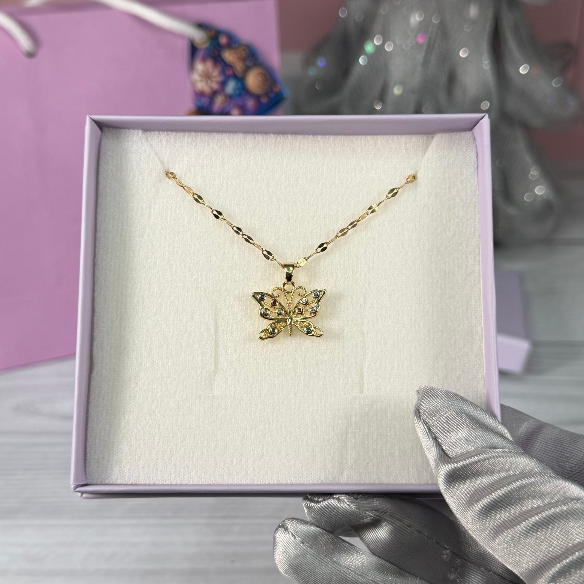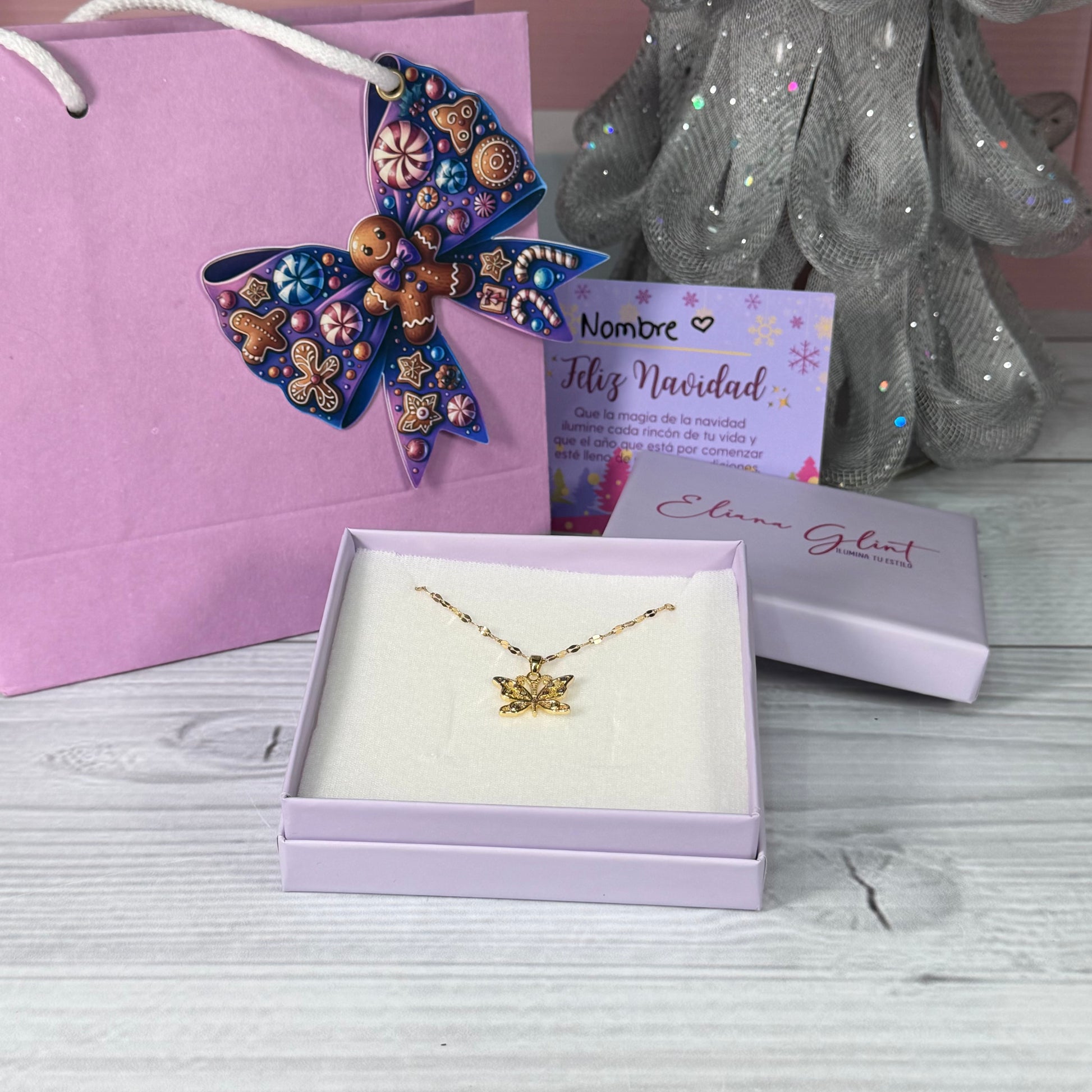 Ilumina esta Navidad con Butterfly Fantasy – Edición Navideña, un collar delicado y lleno de encanto. Su dije de mariposa dorada con incrustaciones multicolor simboliza libertad, transformación y belleza, convirtiéndolo en el regalo perfecto para quienes aman los detalles especiales y brillantes.