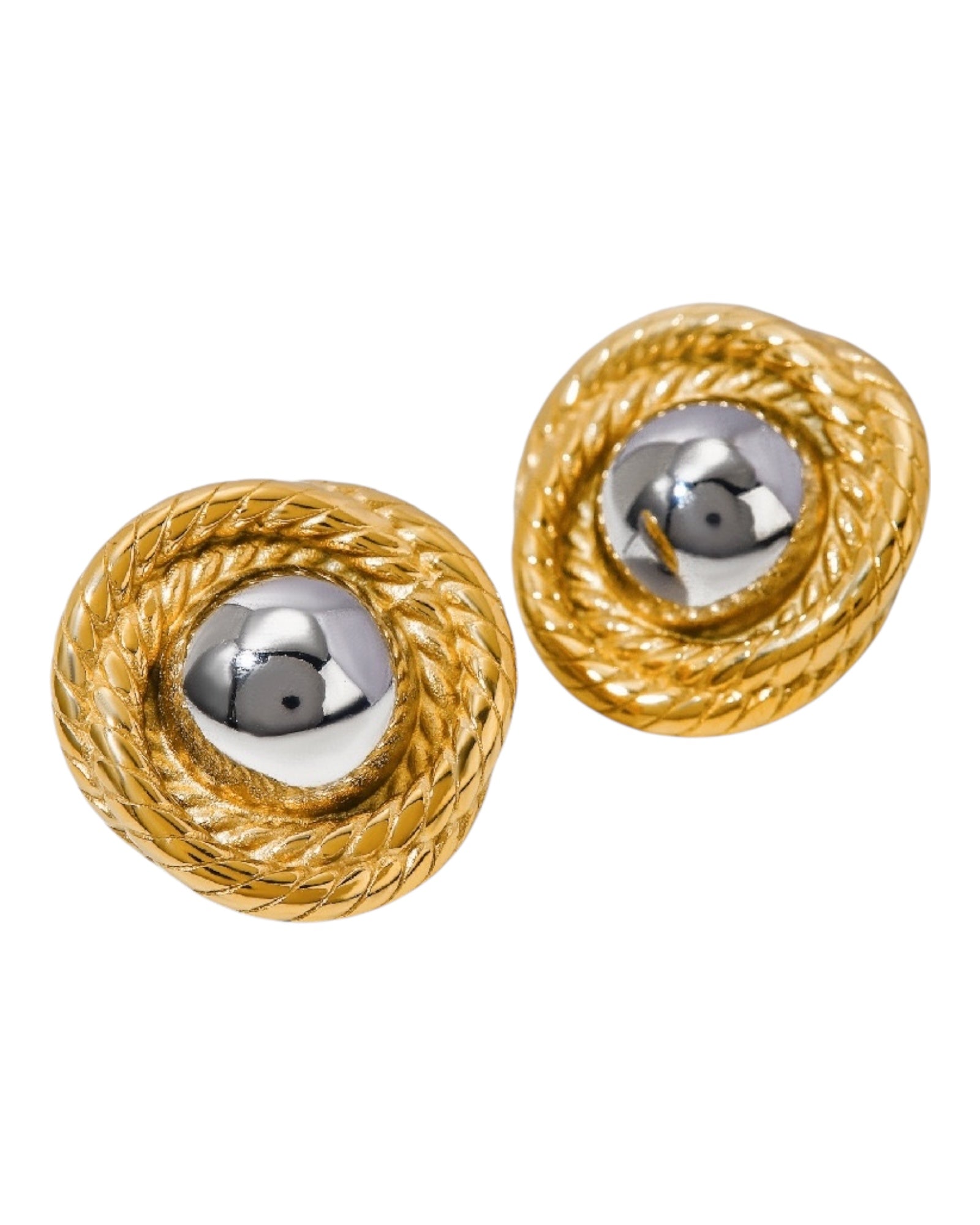 Estos aretes combinan un diseño trenzado dorado con un centro plateado brillante, creando una pieza única y sofisticada.