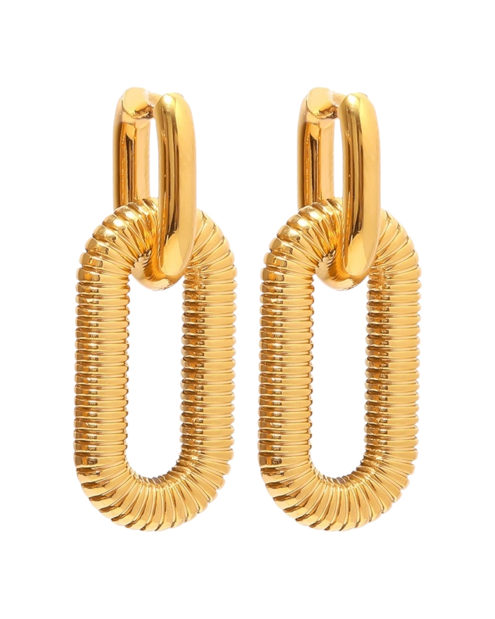Estos aretes tipo cadena cuentan con un acabado dorado brillante y textura acanalada que refleja la luz de manera espectacular.