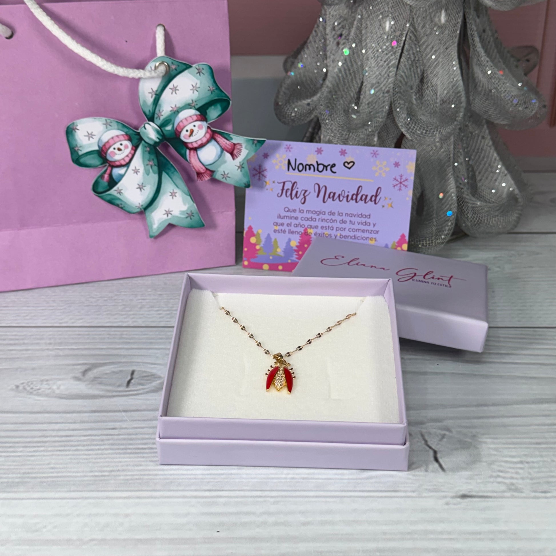 Celebra la magia de la Navidad con Lucky Ladybug – Edición Navideña, un collar tierno y elegante que simboliza buena suerte, protección y deseos que están por cumplirse. Su dije de catarina dorada con alas rojas esmaltadas y zirconias brillantes lo convierte en un accesorio único, lleno de luz y significado.