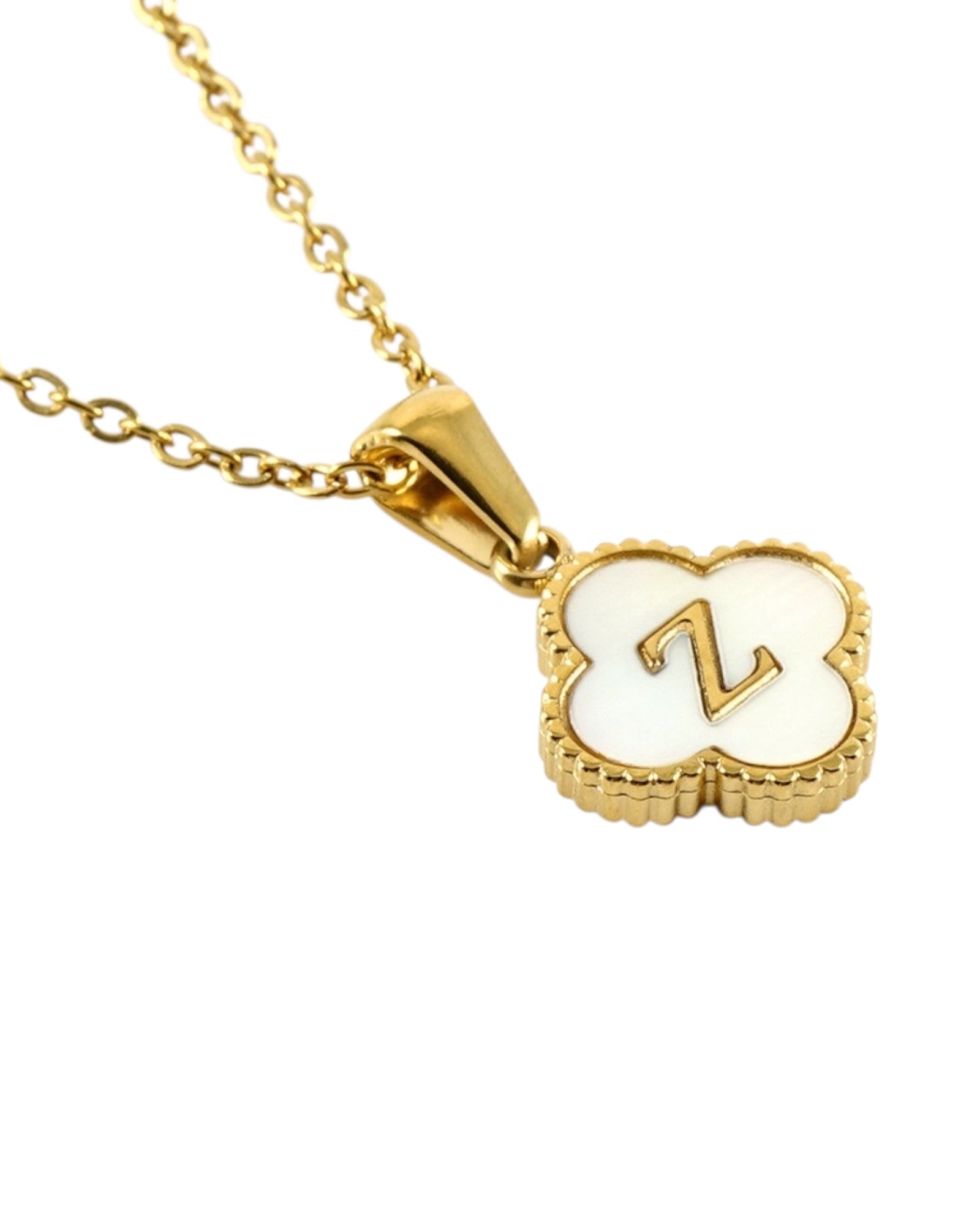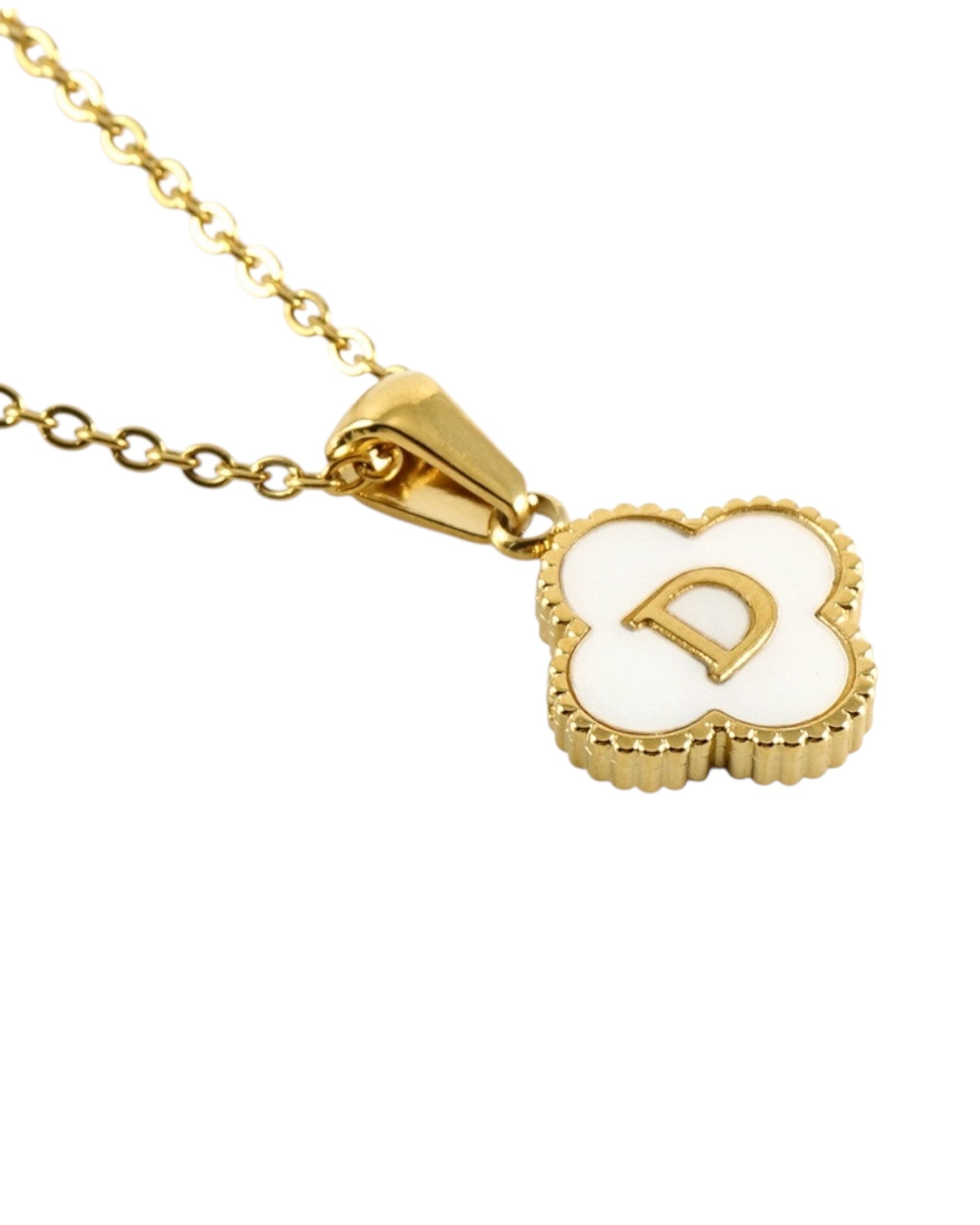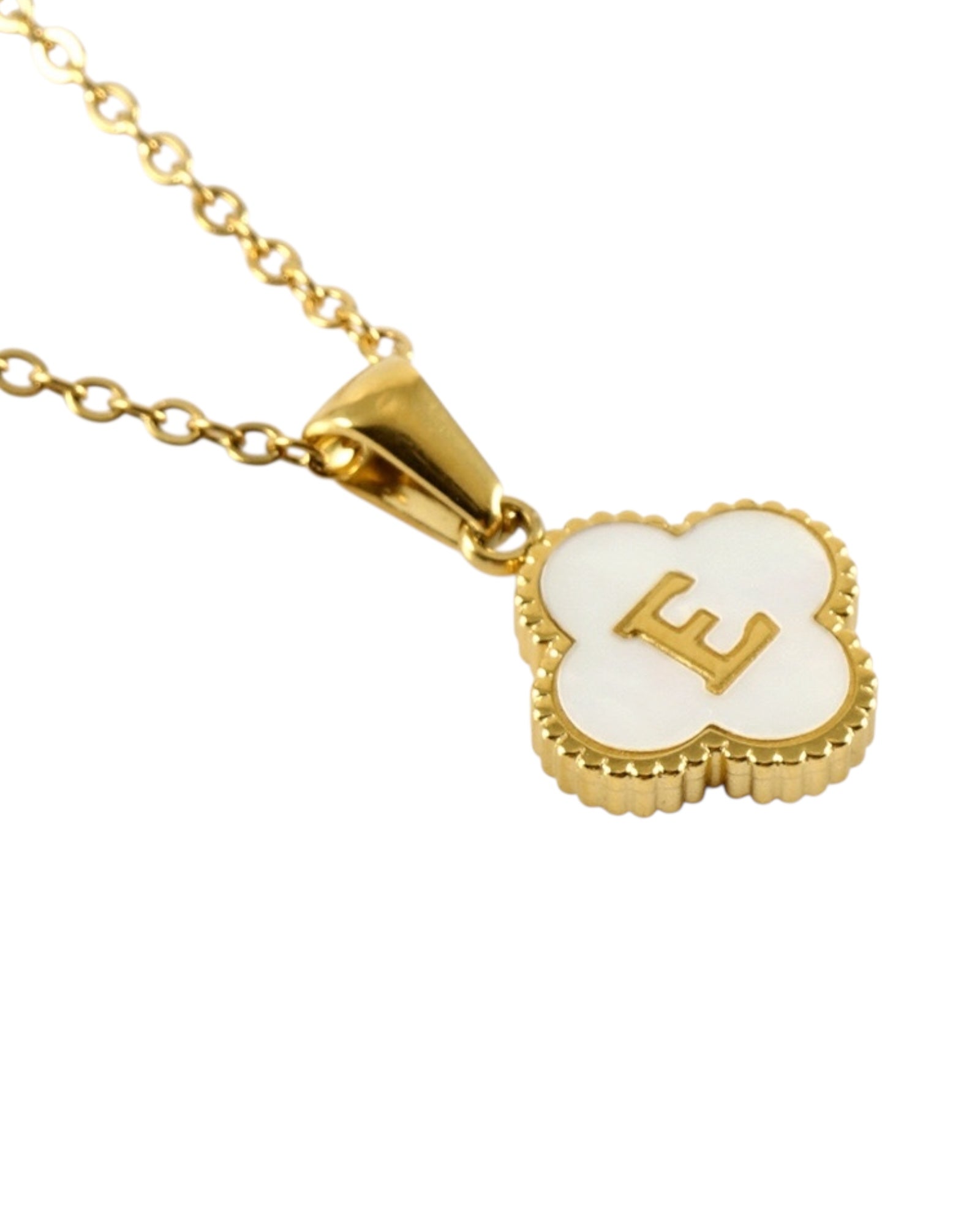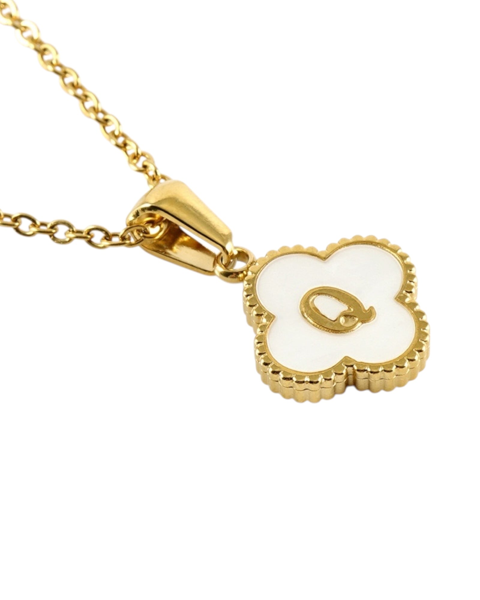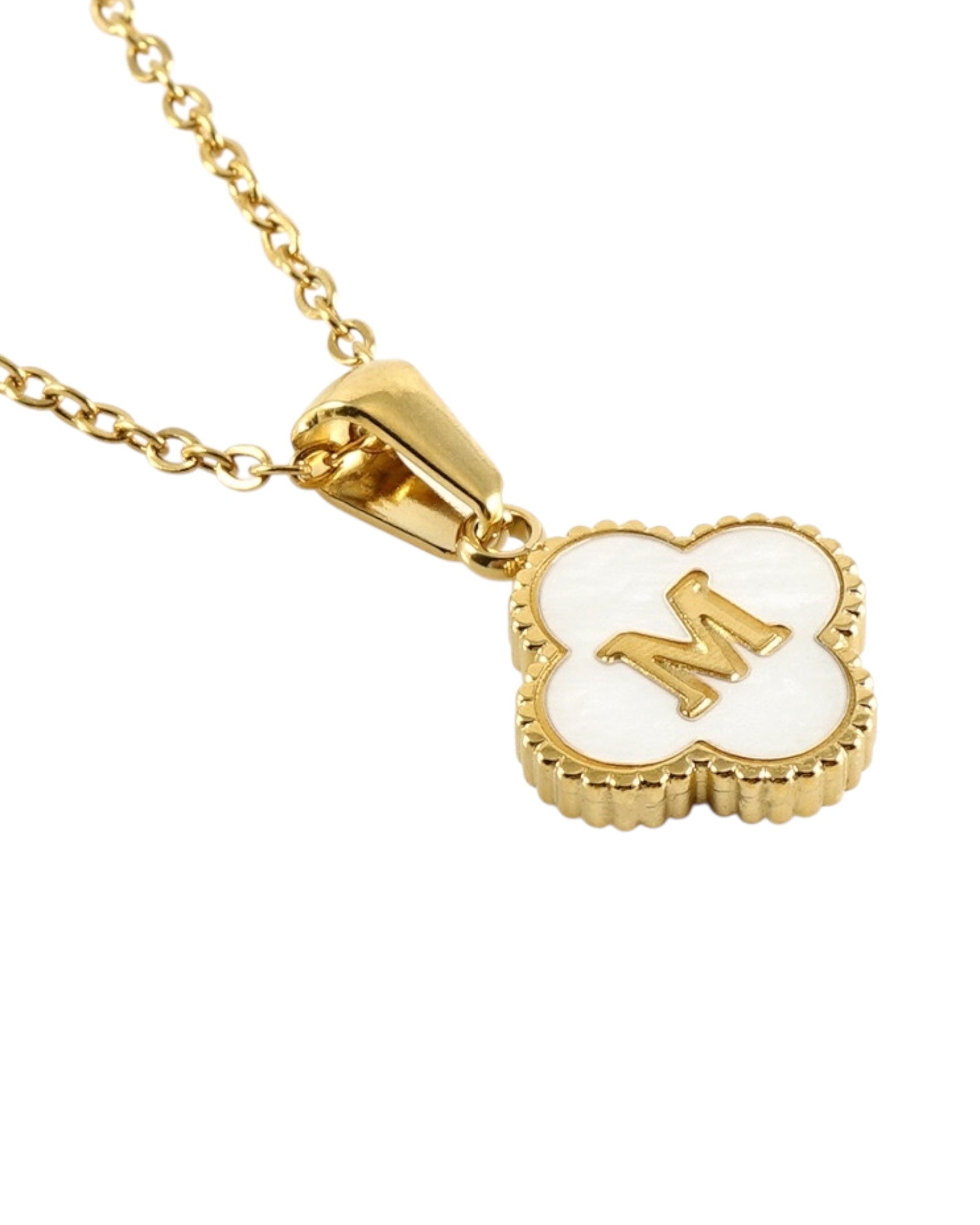 Este collar presenta un dije en forma de trébol con fondo blanco nacarado y tu inicial grabada al centro, ideal para lucir tu letra favorita o regalar con significado especial.