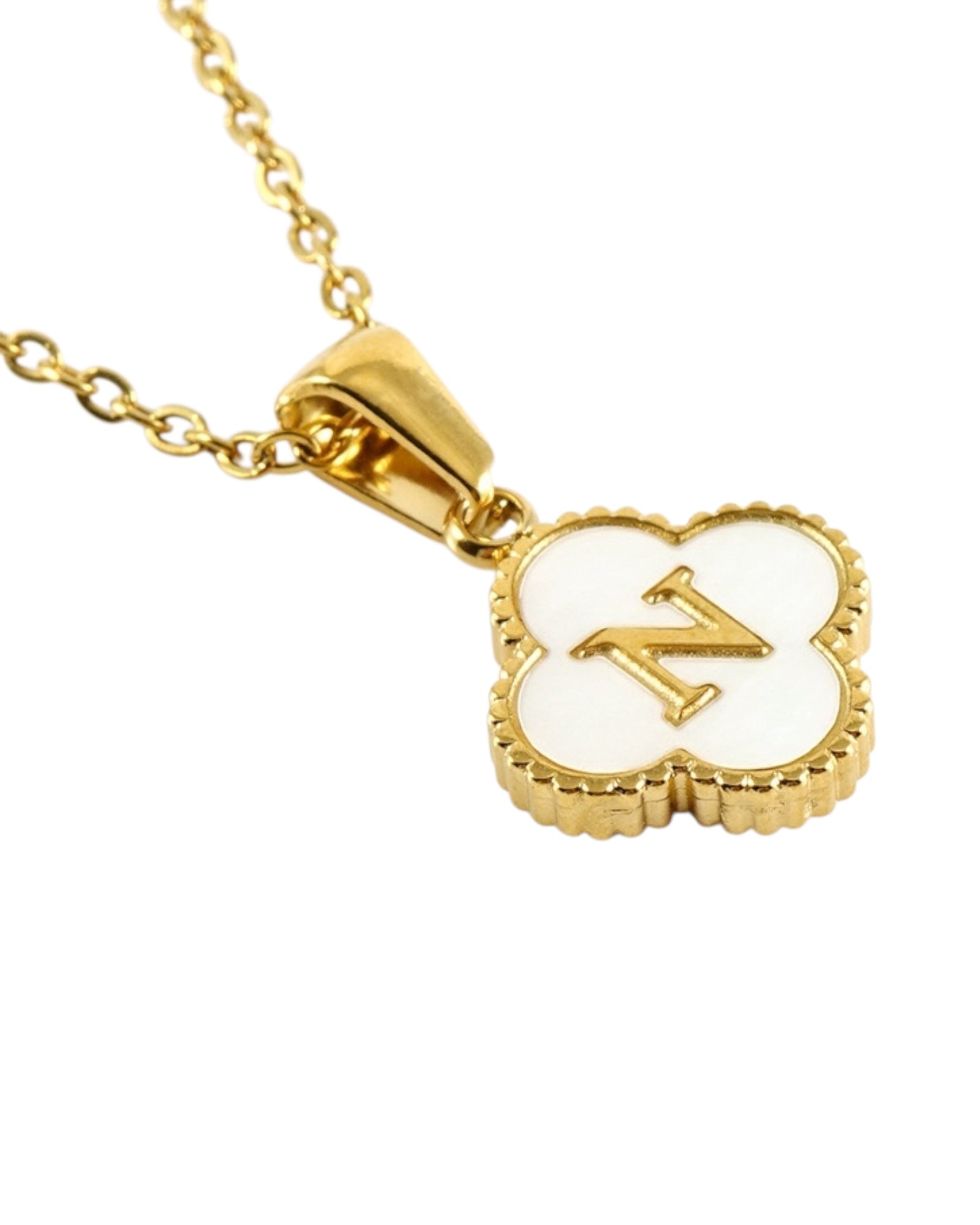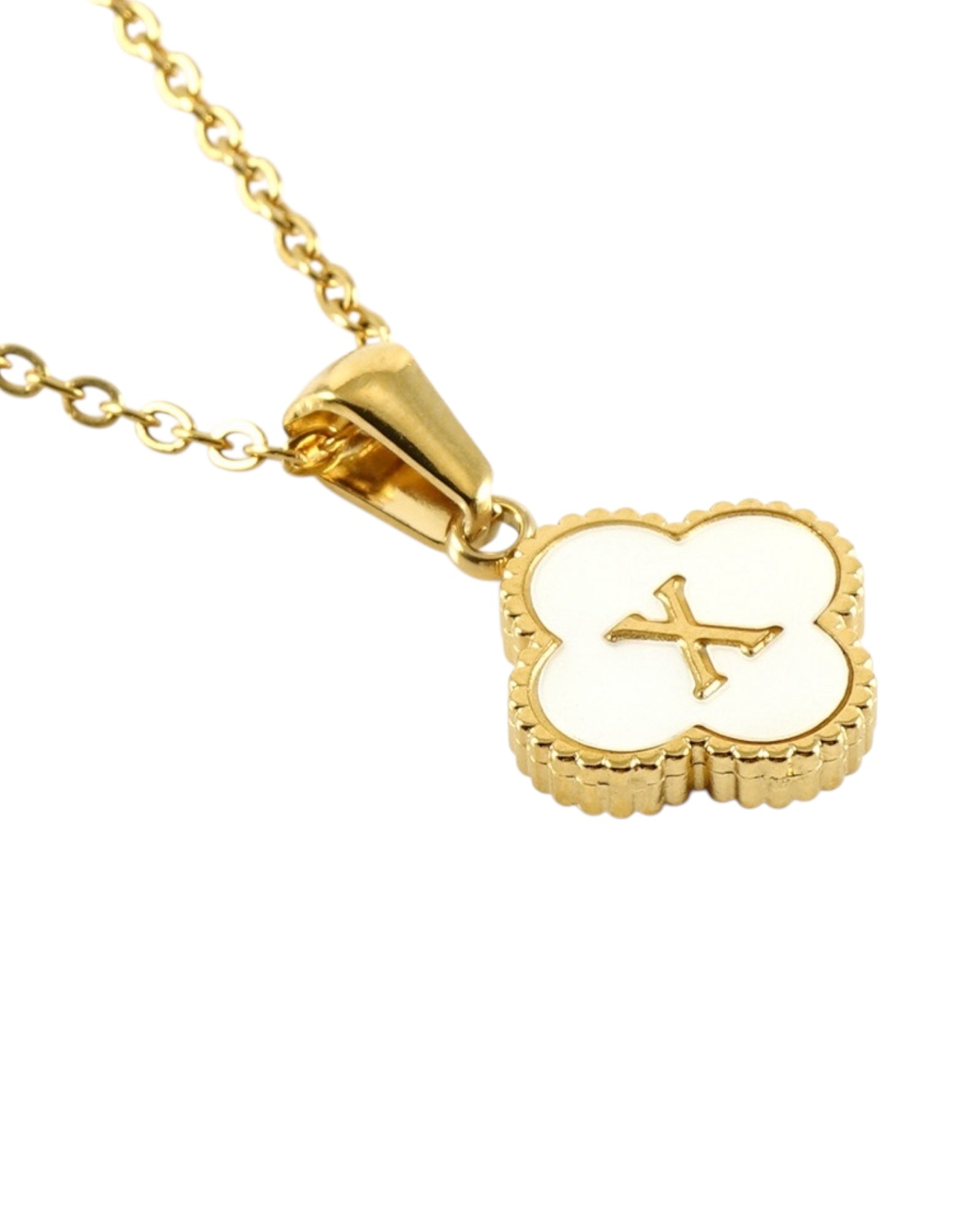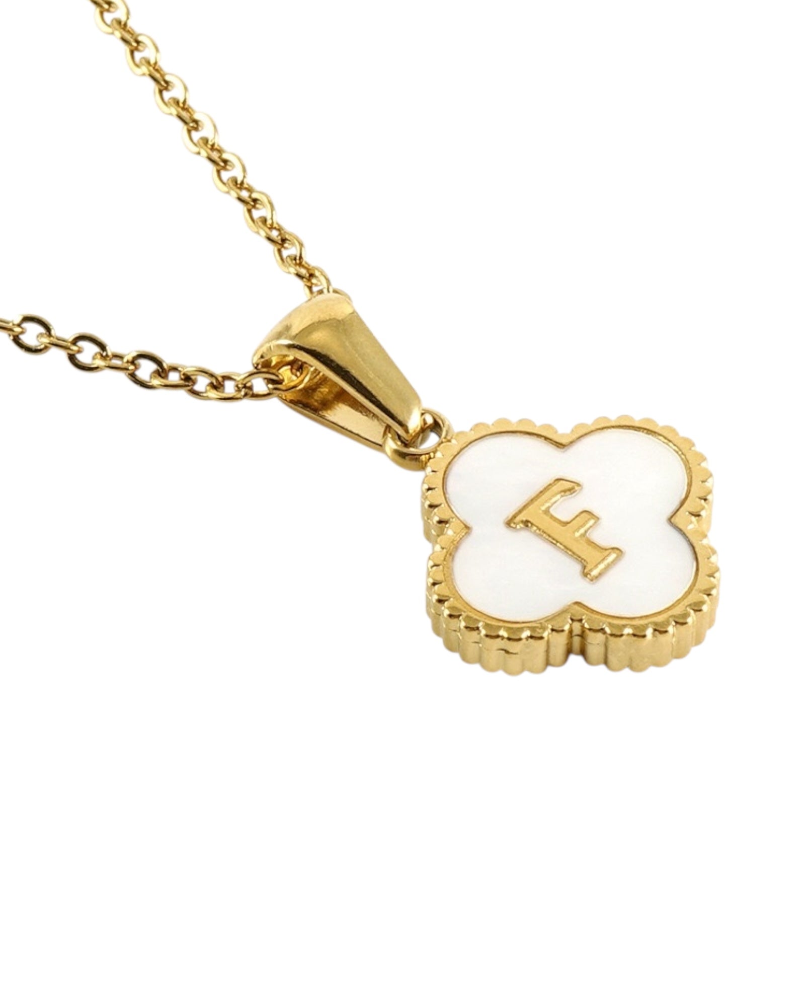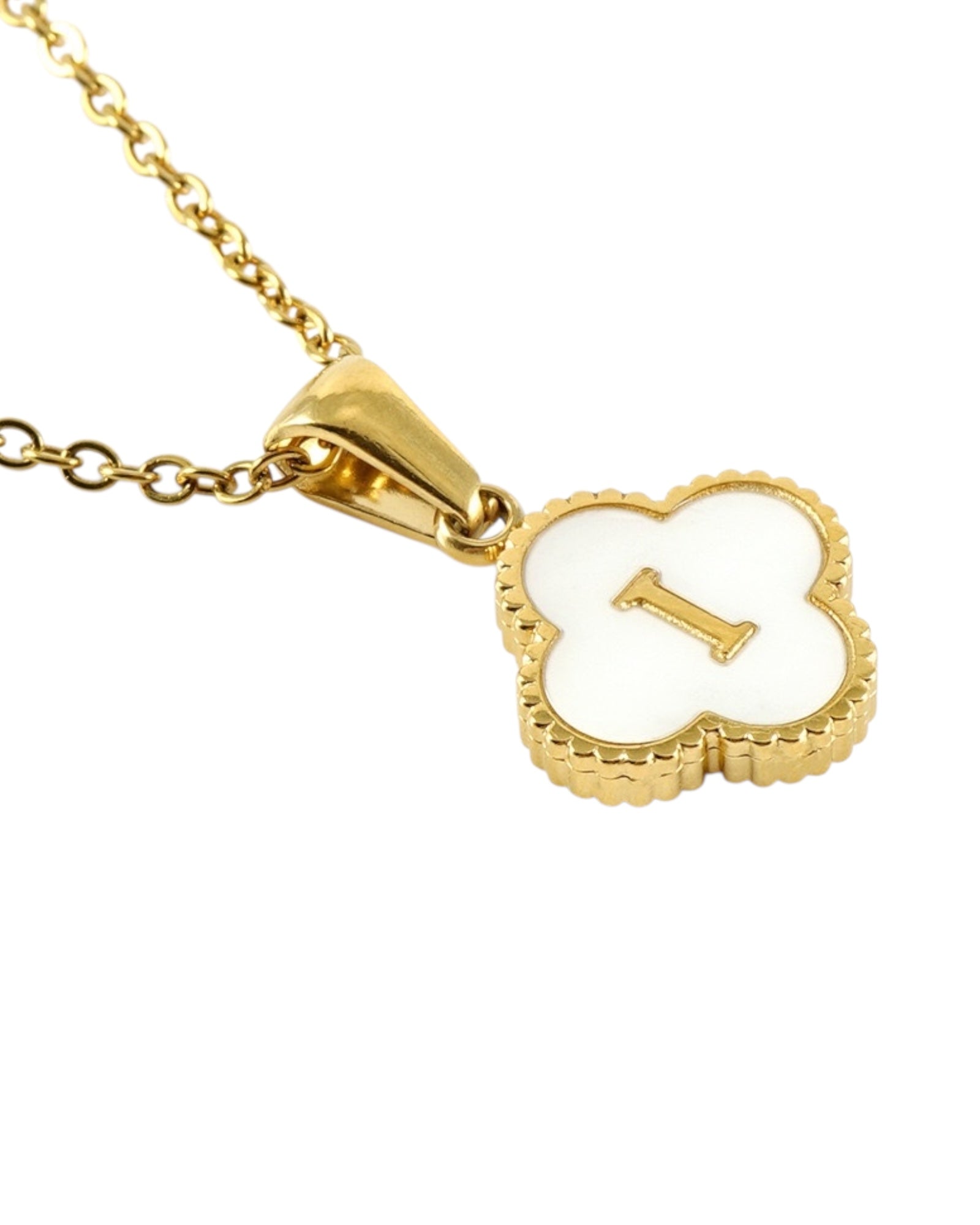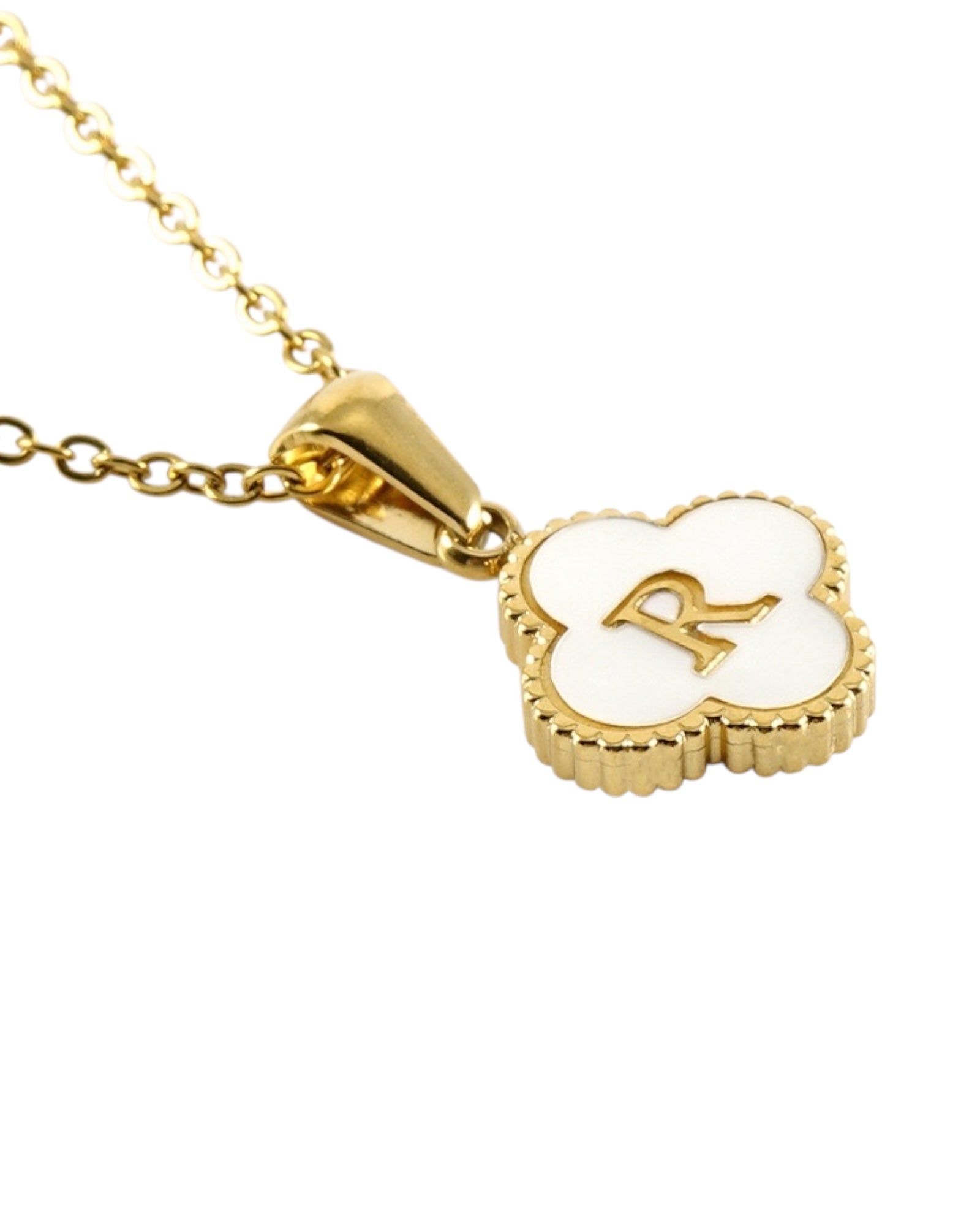 Este collar presenta un dije en forma de trébol con fondo blanco nacarado y tu inicial grabada al centro, ideal para lucir tu letra favorita o regalar con significado especial.