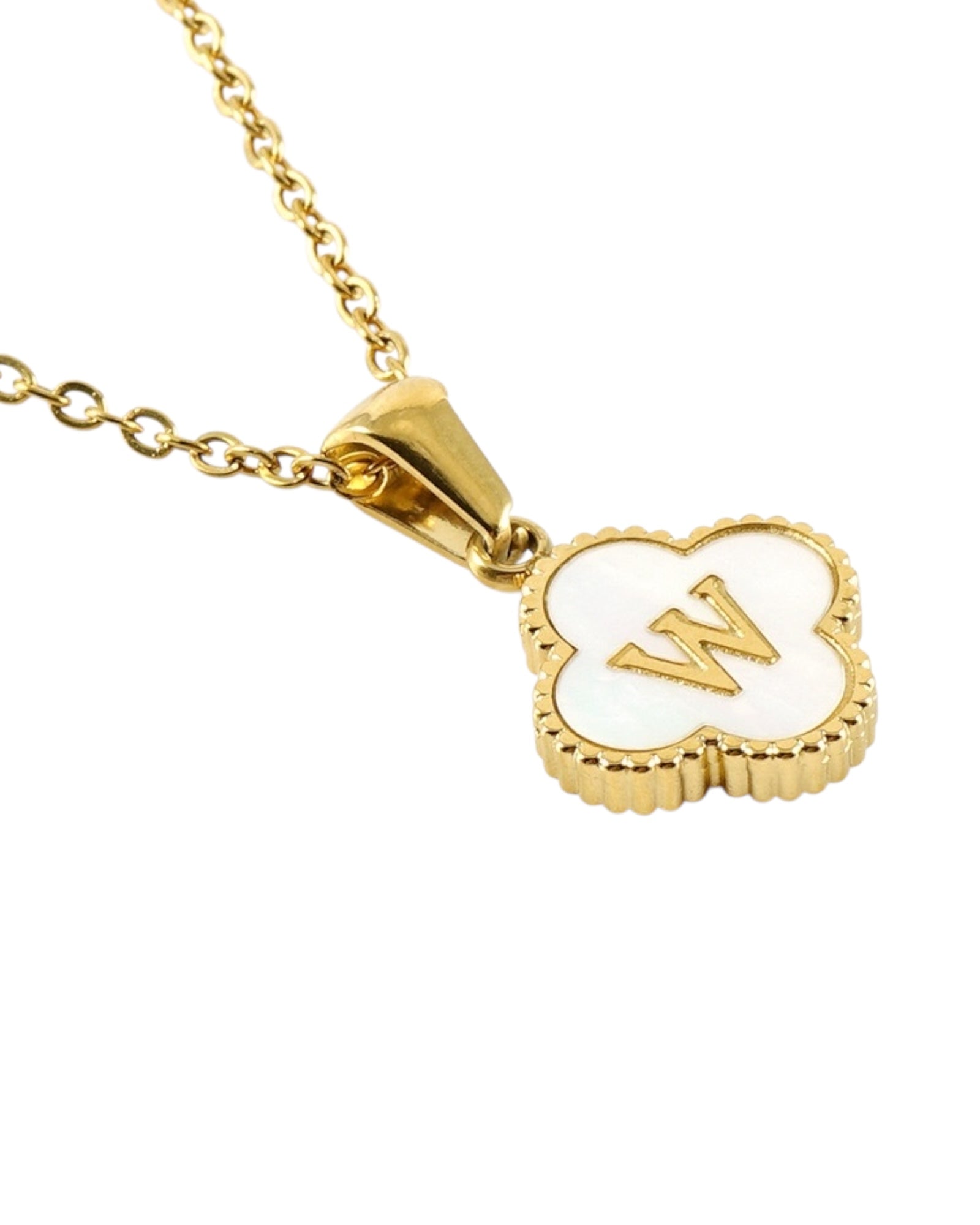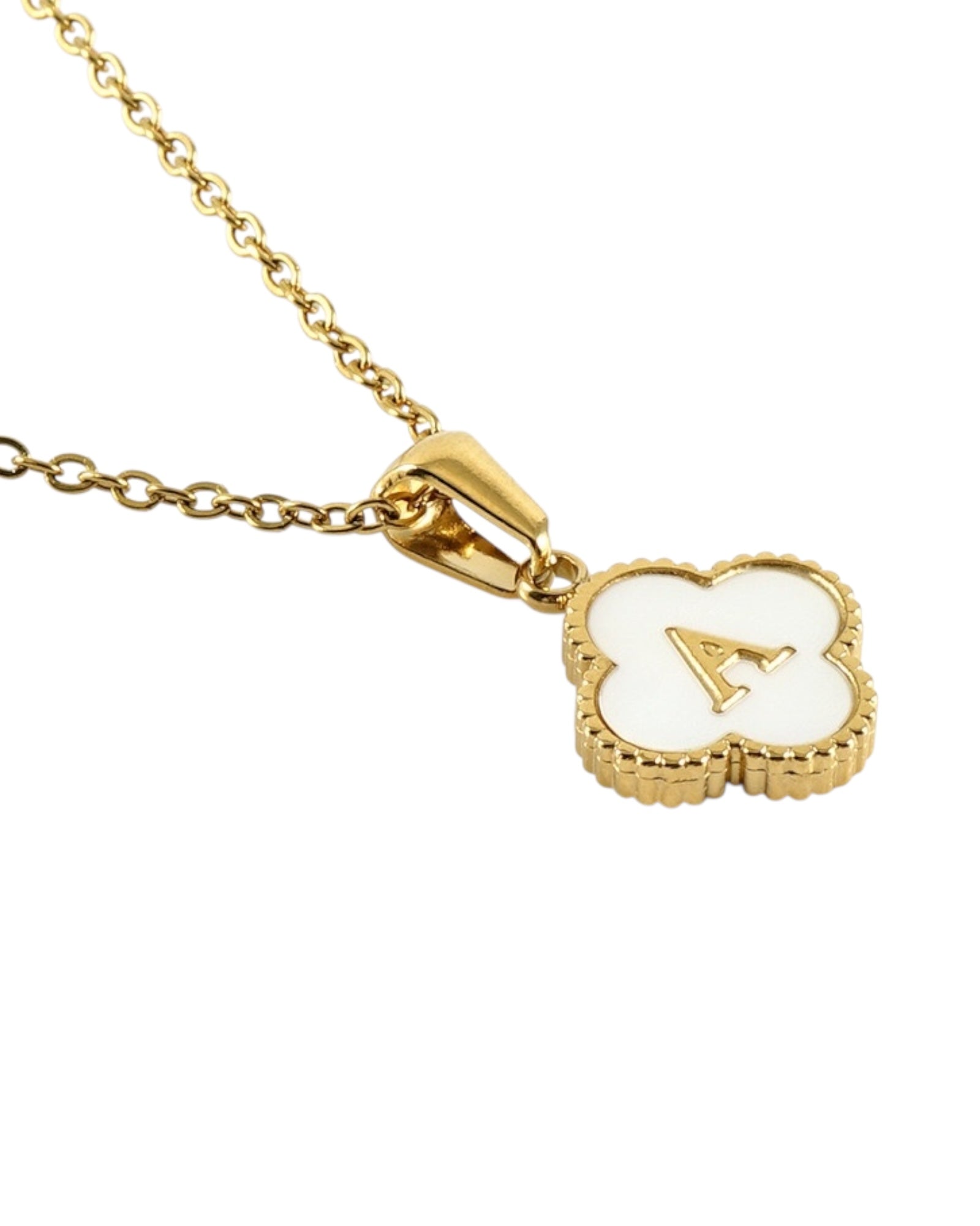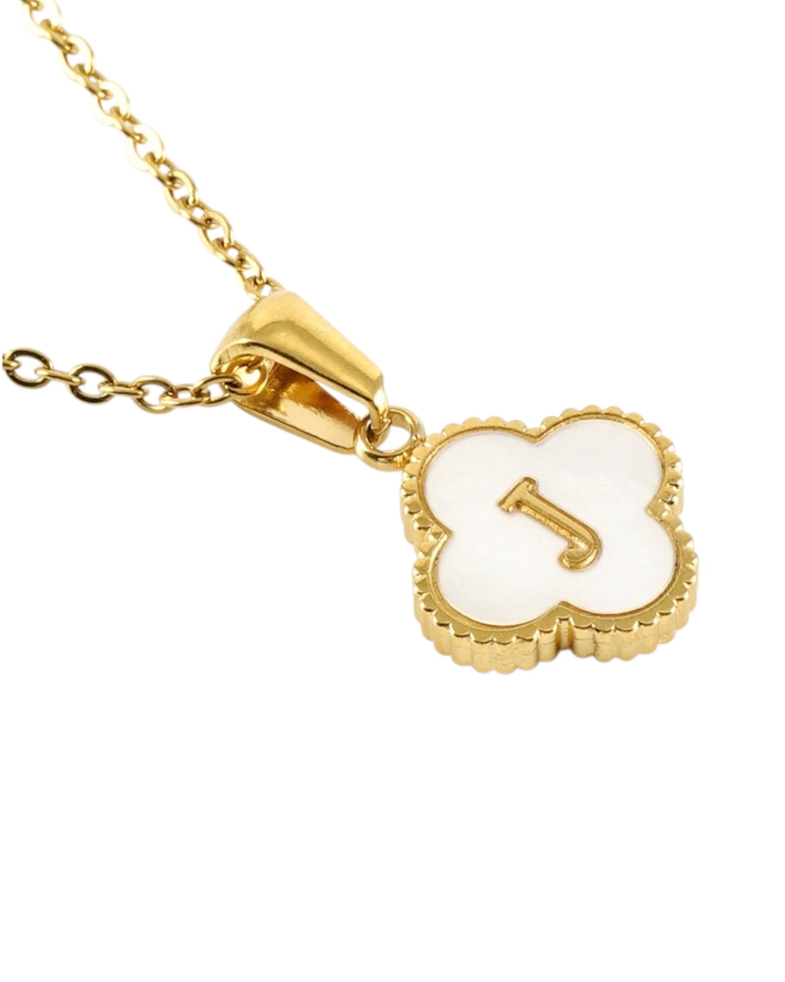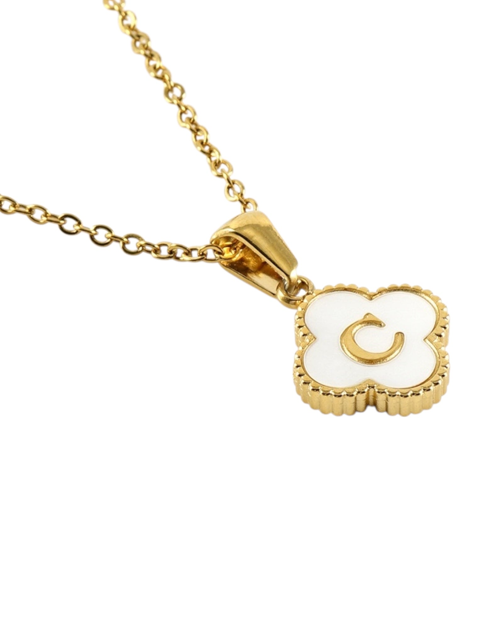 Este collar presenta un dije en forma de trébol con fondo blanco nacarado y tu inicial grabada al centro, ideal para lucir tu letra favorita o regalar con significado especial.