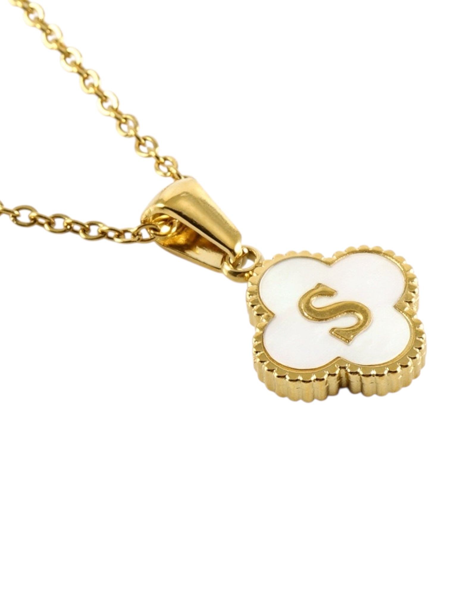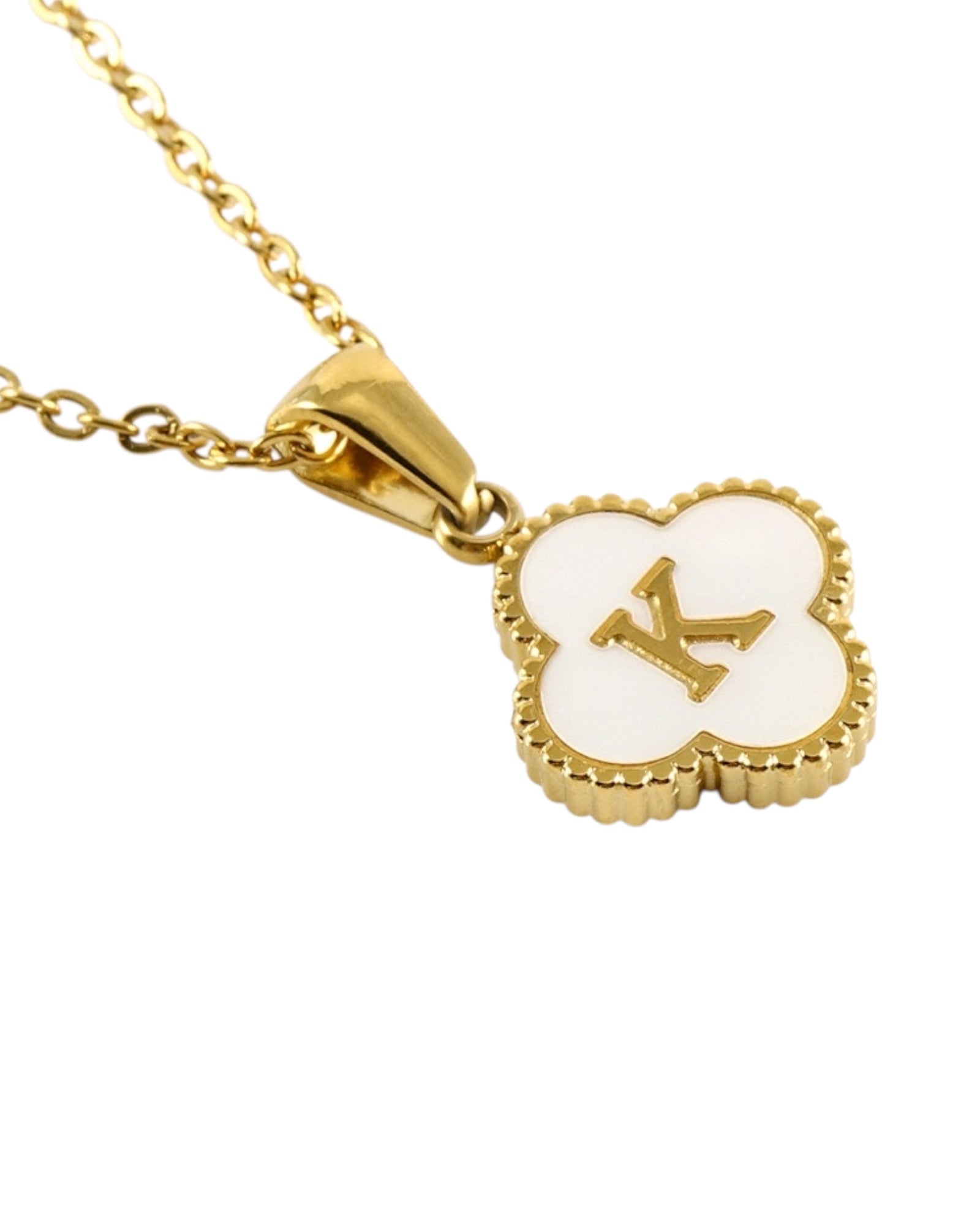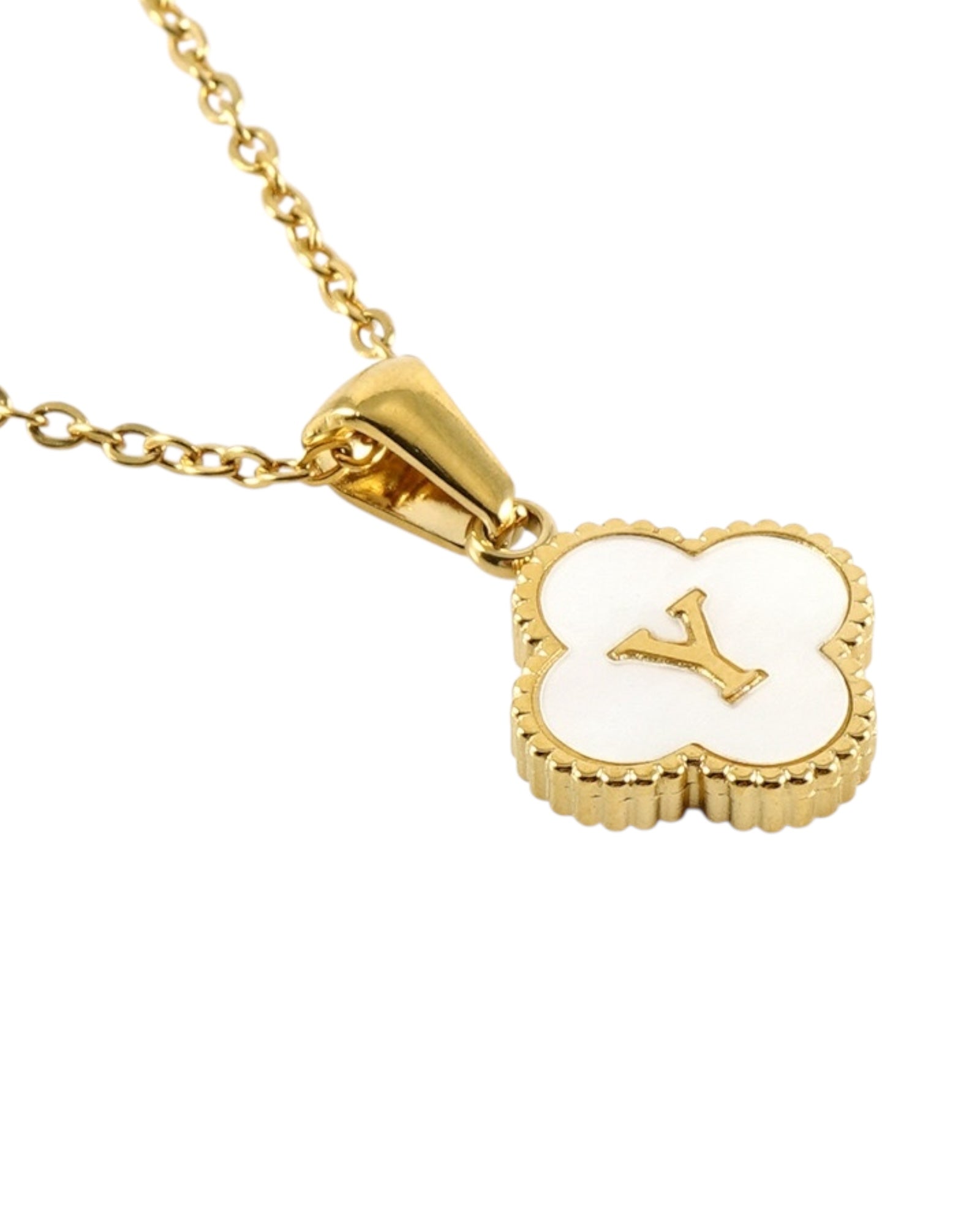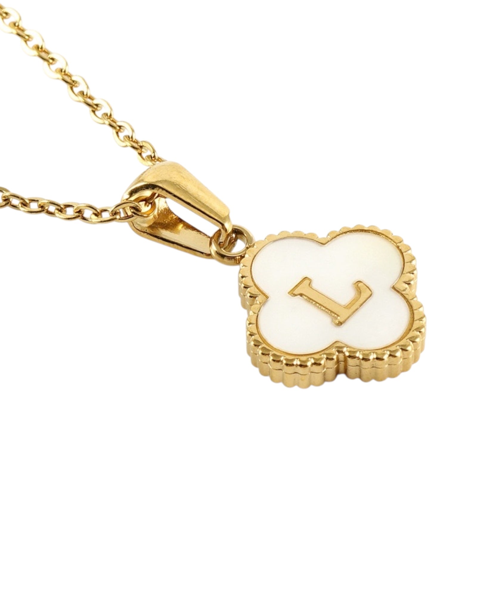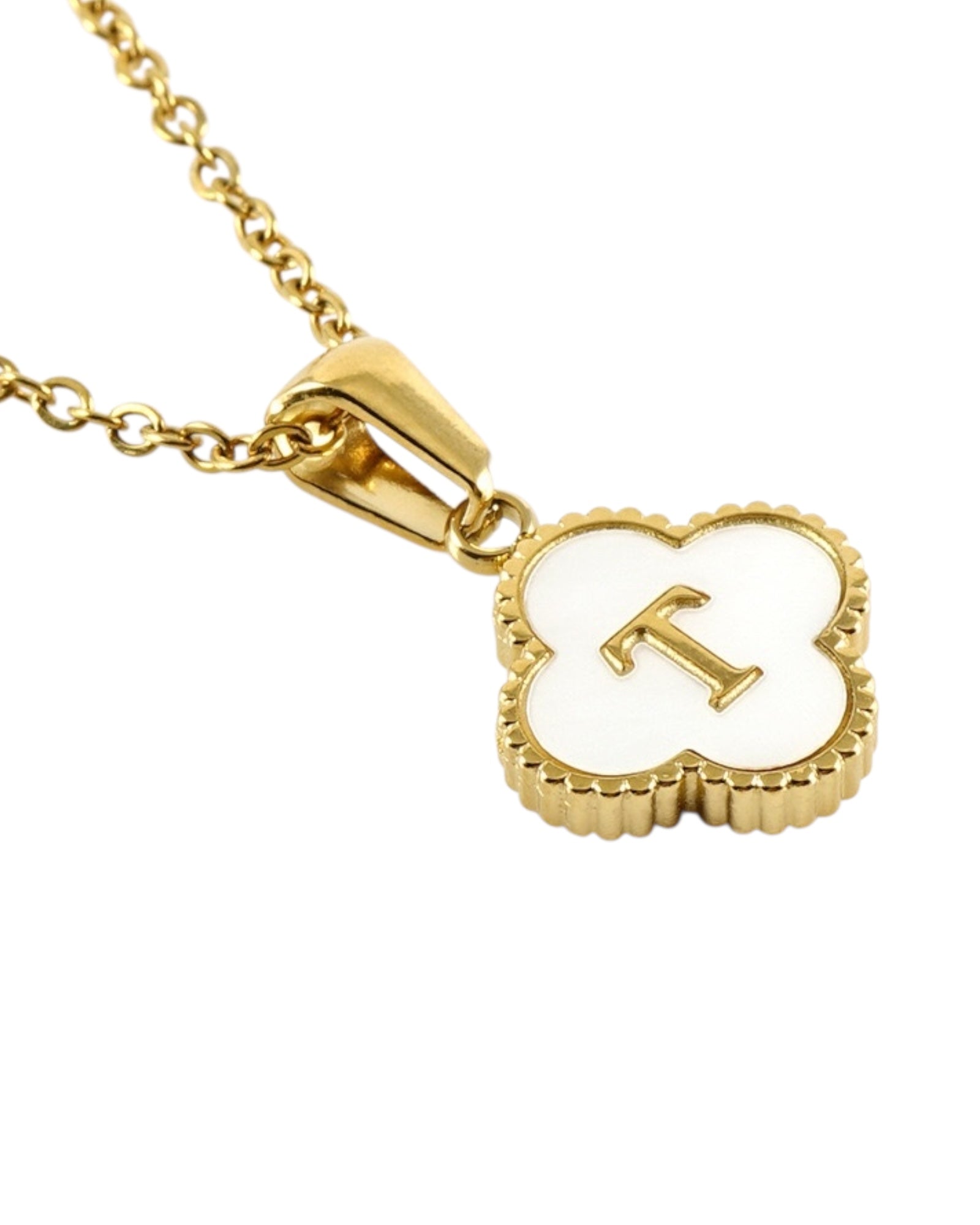 Este collar presenta un dije en forma de trébol con fondo blanco nacarado y tu inicial grabada al centro, ideal para lucir tu letra favorita o regalar con significado especial.