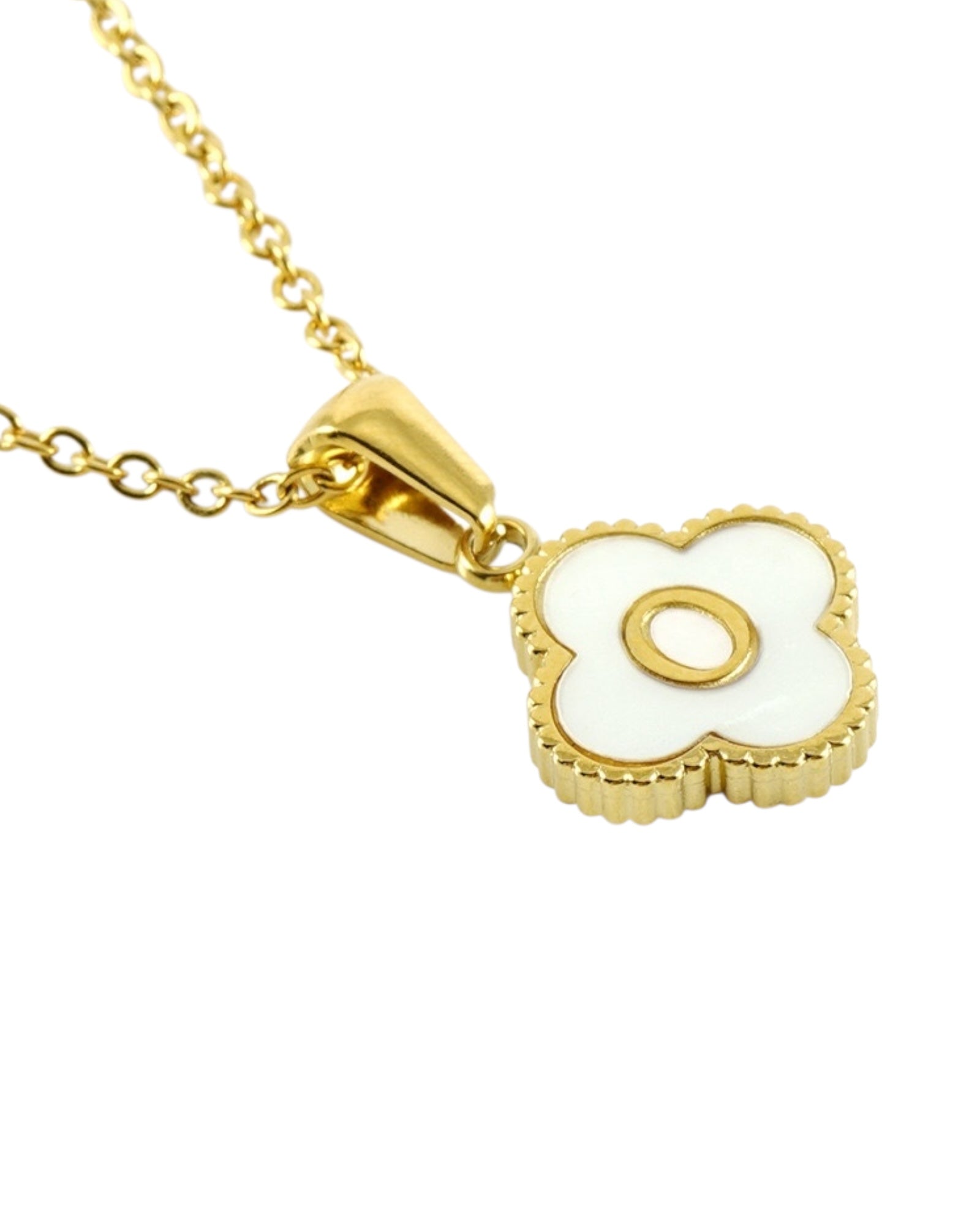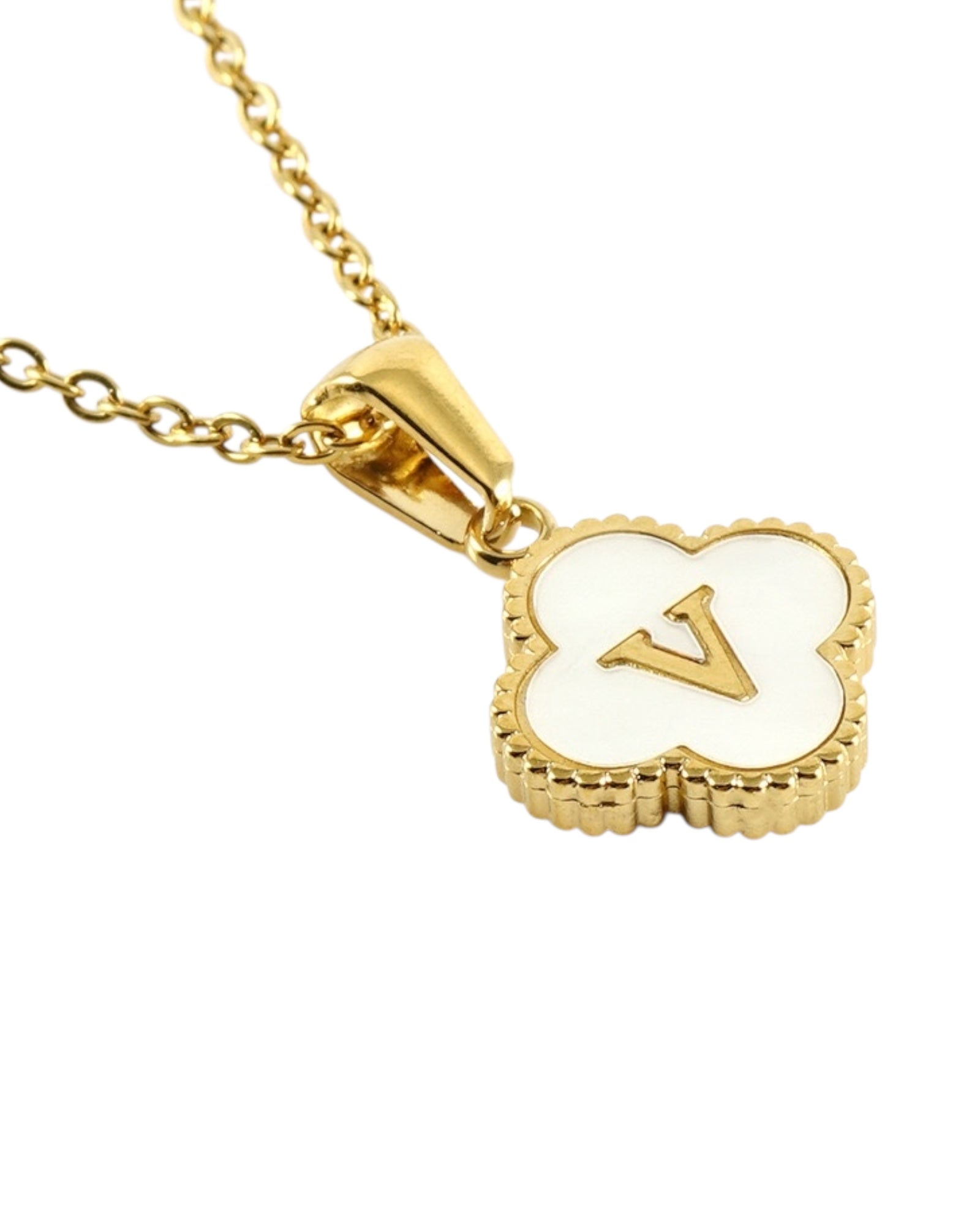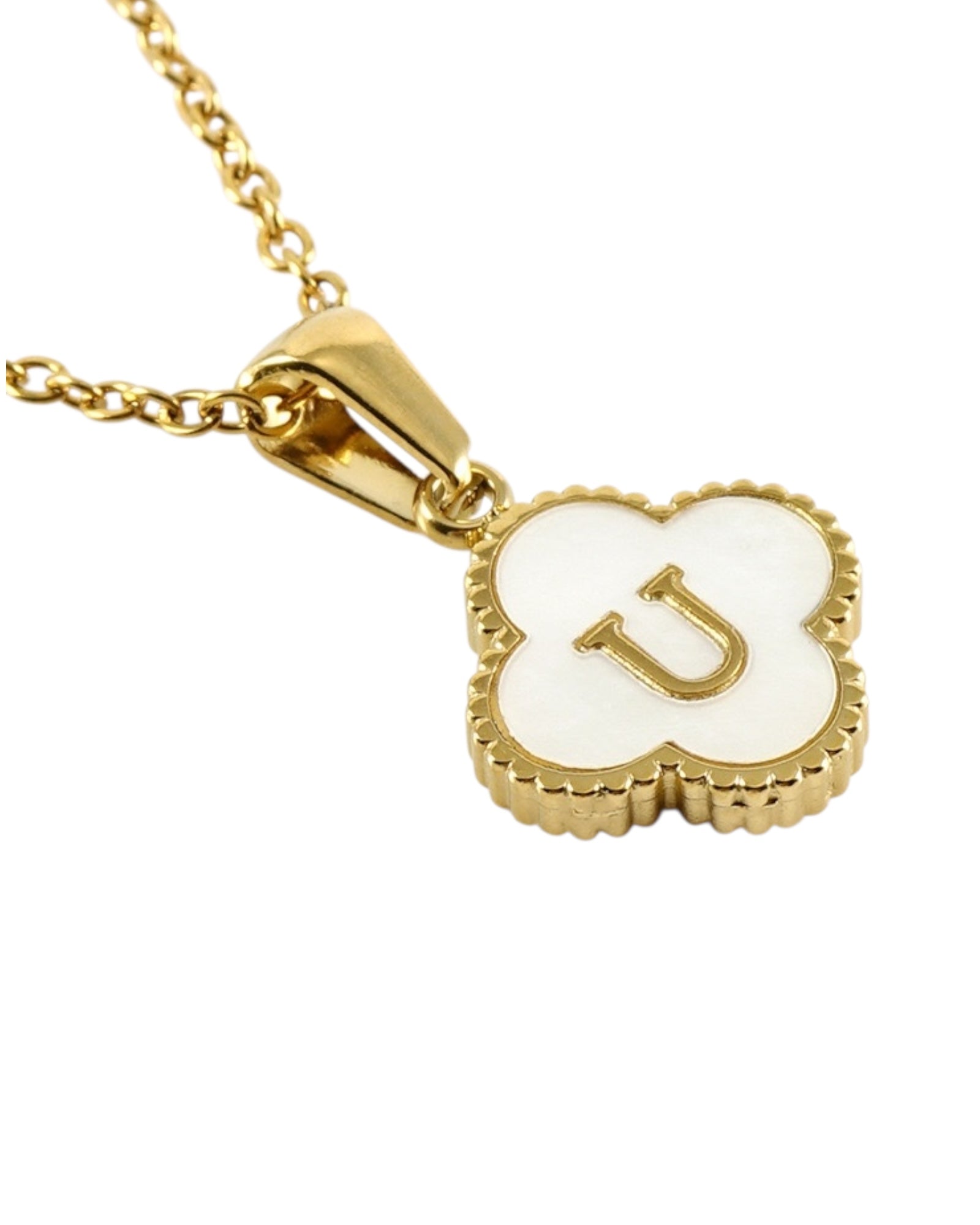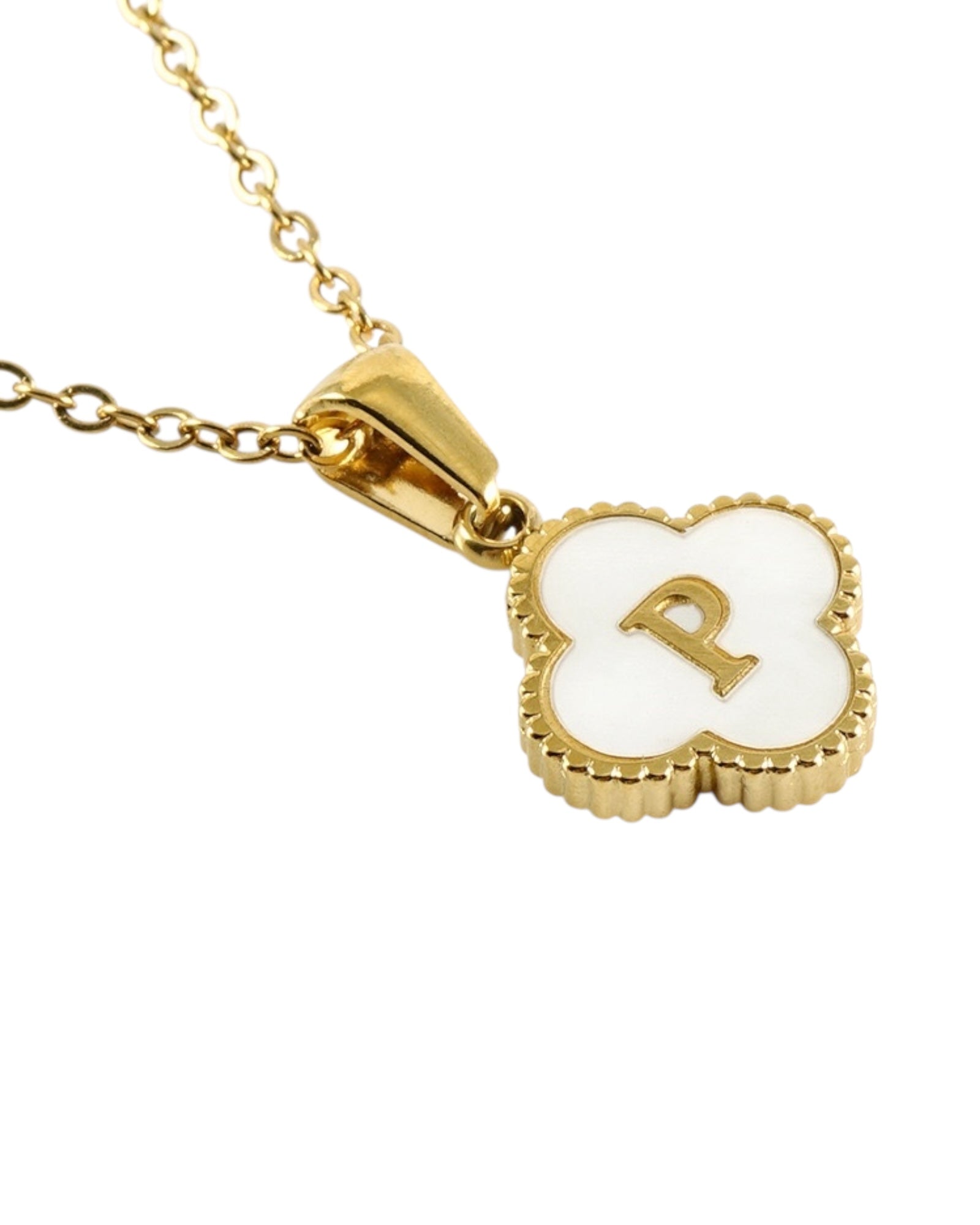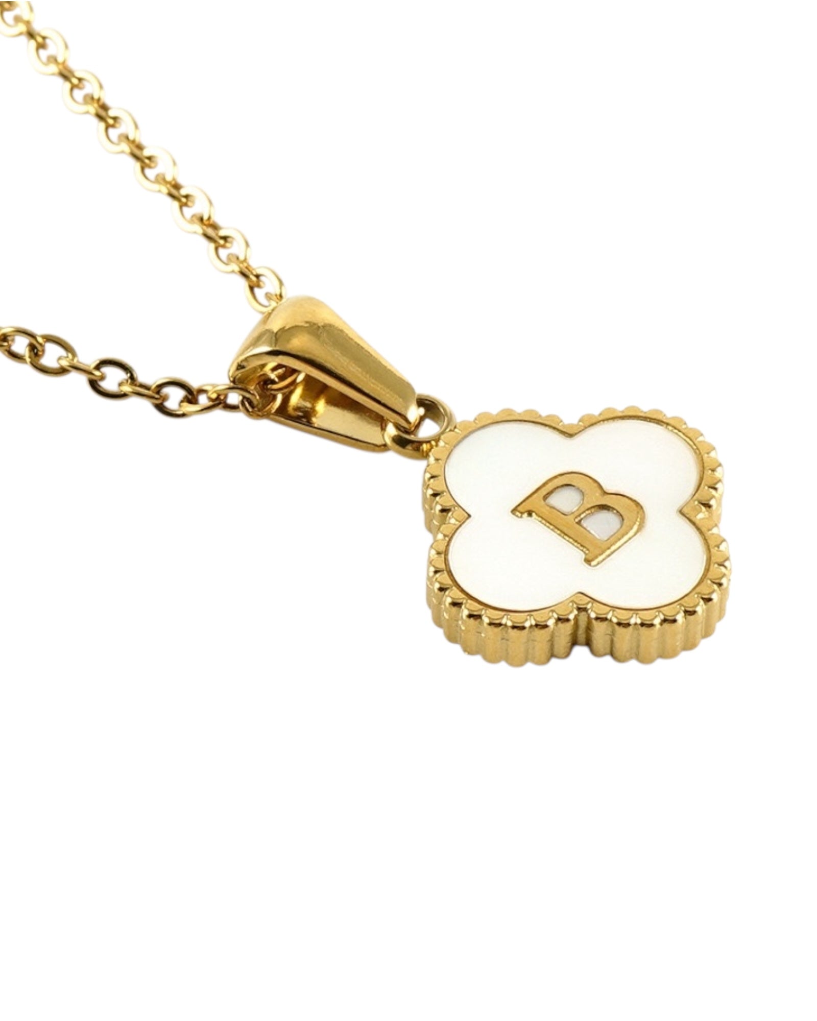 Este collar presenta un dije en forma de trébol con fondo blanco nacarado y tu inicial grabada al centro, ideal para lucir tu letra favorita o regalar con significado especial.